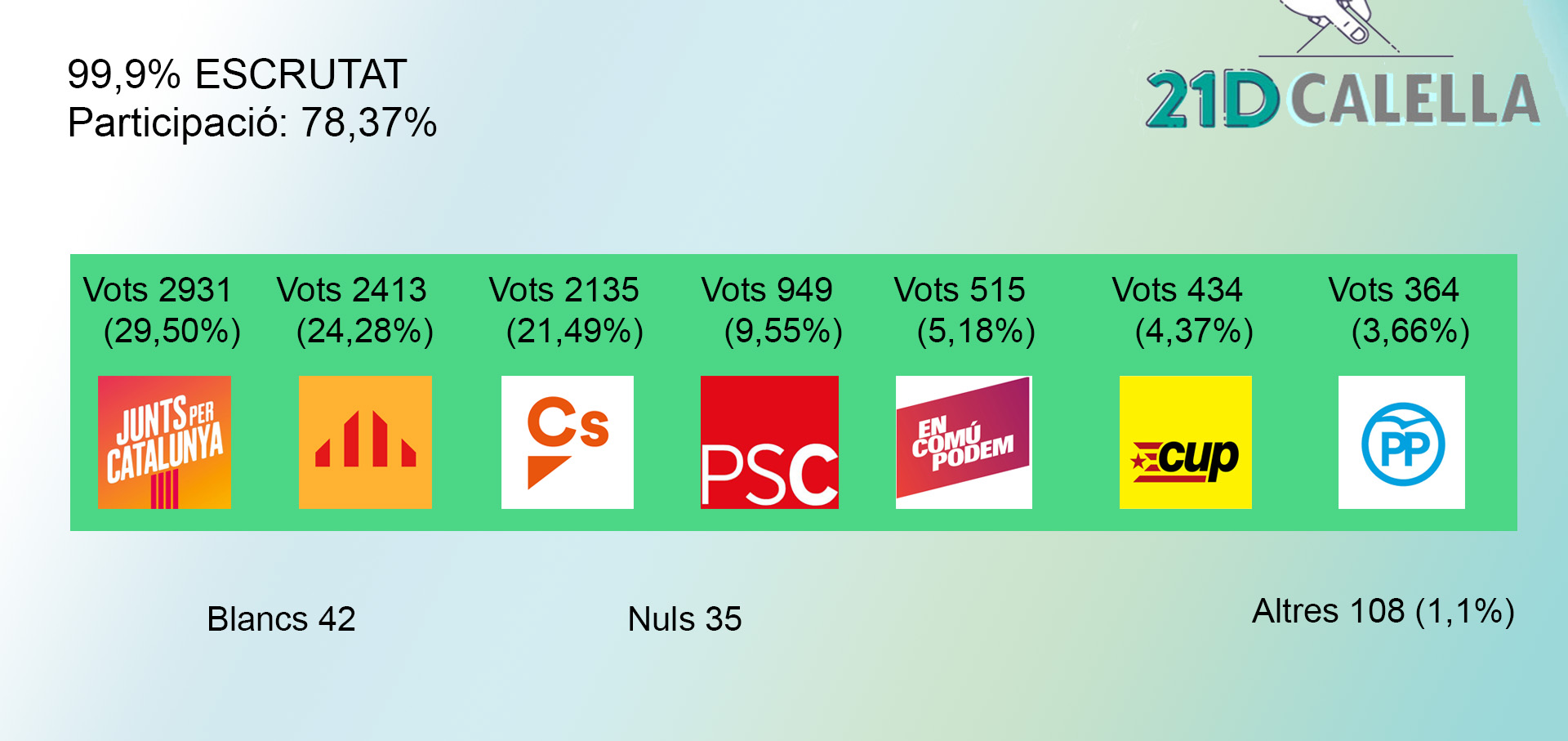 Junts per Catalunya guanya les eleccions al Parlament de Catalunya a Calella, i els partits de l’anomenat bloc sobiranista obtenen el 58,1% dels vots a la ciutat. Ciutadans gairebé doble el nombre de suports, i guanya en sis de les 19 meses electorals habilitades a Calella. S’assoleix una participació rècord del 78,37%