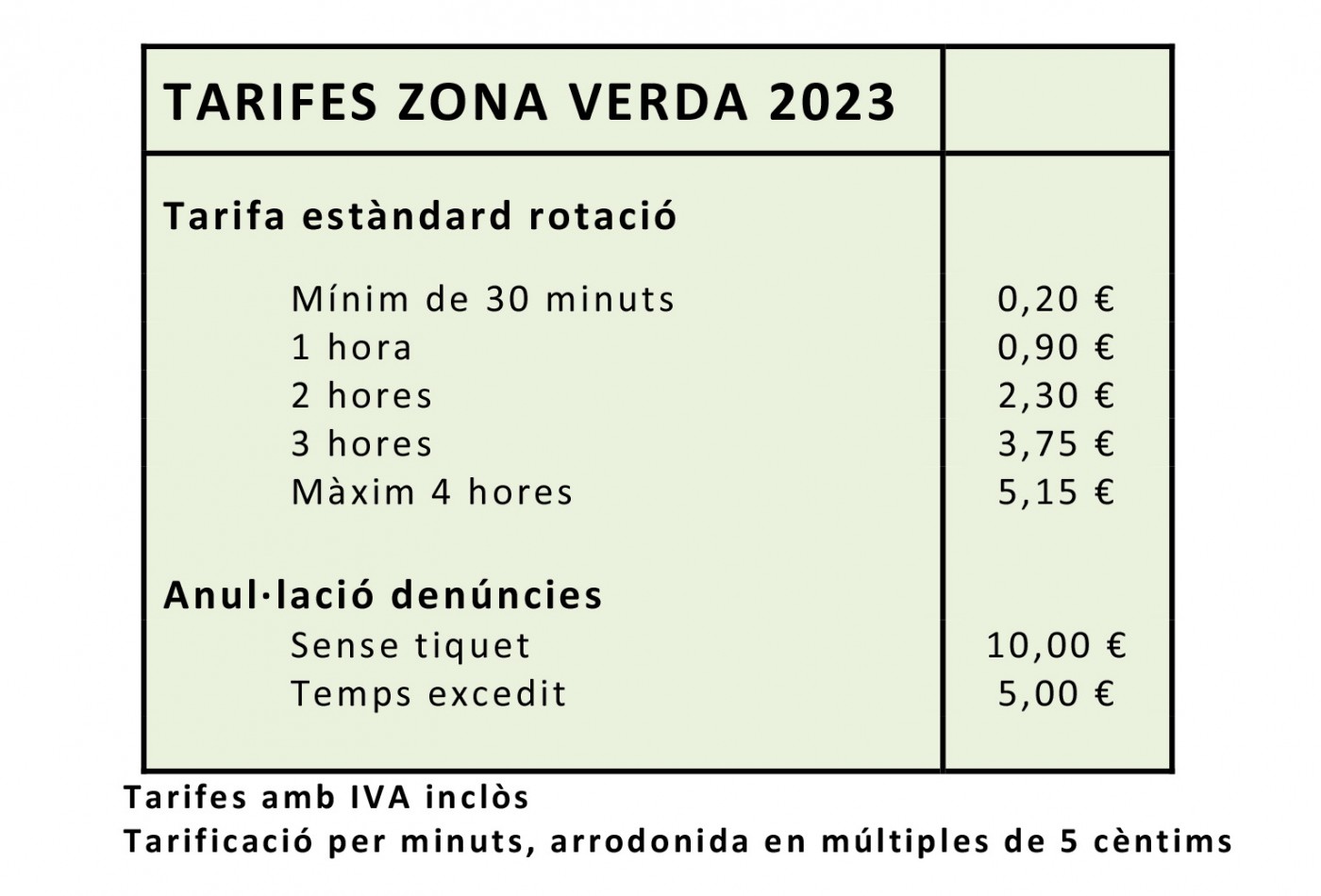 Per als no residents, la zona verda disposa de les mateixes tarifes, horaris i dies de servei que la zona blava estàndard. S’ha de pagar de dilluns a dissabtes (no festius), de 9 a 14h i de 16 a 20h.