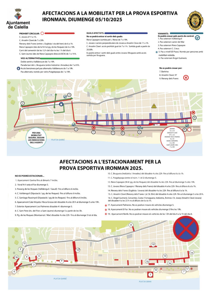 La Policia Local ha publicat un cartell i un mapa amb el detall de les afectacions de mobilitat i aparcament que començaran aquest dissabte, 4 d’octubre, amb motiu de l’IRONMAN Calella-Barcelona. La prova internacional farà passar per la ciutat part dels circuits de bicicleta i cursa a peu, i acollirà també la sortida de la natació, que enguany es trasllada a la zona del cementiri arran del projecte de naturalització de les platges. Els vianants podran creuar la via del tren i accedir al Passeig Manuel Puigvert pels passos soterrats. Les persones amb mobilitat reduïda disposaran del pas a nivell d’El Paso, on personal de l’organització oferirà suport i indicacions.