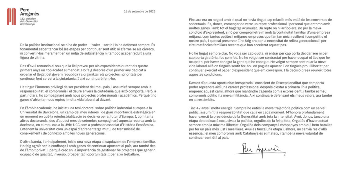 Pere Aragonès ha comunicat que renuncia a la retribució fixada per llei per a tots els expresidents de la Generalitat de Catalunya, càrrec que va ostentar entre els anys 2021 i 2024. El pinedenc, excoordinador nacional d’Esquerra Republicana, fa el pas a l’empresa privada per ocupar-se de la cadena hotelera que ha dirigit la seva família els últims 60 anys, tal com ha detallat aquest matí en una entrevista a Catalunya Ràdio. “No volia que em donessin un càrrec per anar fent i tenir un sou per allargar fins a la jubilació”, ha indicat Aragonès, que tenia una assignació anual de gairebé 93.000 euros. Amb tot, mantindrà activa l’oficina i l’agenda institucional, que compaginarà també amb la seva nova tasca com a professor associat d’Història Econòmica a la Universitat de Vic.