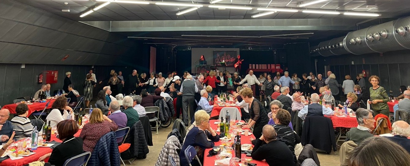 Marxem fins a la sala polivalent de la Fàbrica Llobet Guri de Calella perquè allà està la nostra companya la Naomi Esteve on s’està celebrant el ball de Nadal de la Gent Gran i es troba amb el president del col·lectiu.