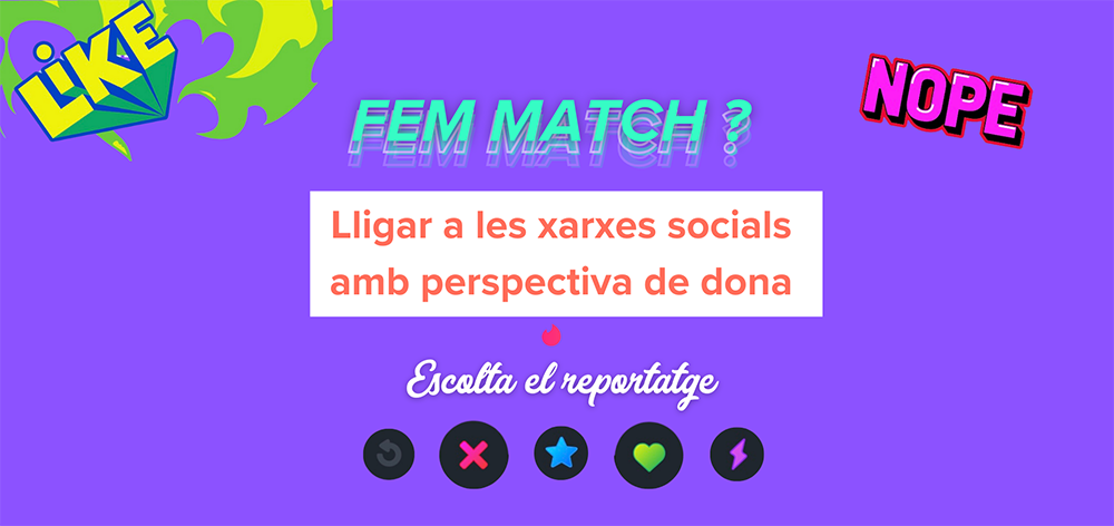 Per aquest 8M Ona Maresme i Ràdio Calella TV portem el testimoni de 8 dones que han utilitzat aplicacions per lligar. Es té en compte la perspectiva de gènere? Tenen les mateixes preocupacions elles i ells? Se senten còmodes a través d’una pantalla? Reflexionem sobre les noves formes de trobar l’interès romàntic a través de les xarxes socials amb “Fem match? Lligar a les xarxes socials amb perspectiva de dona”