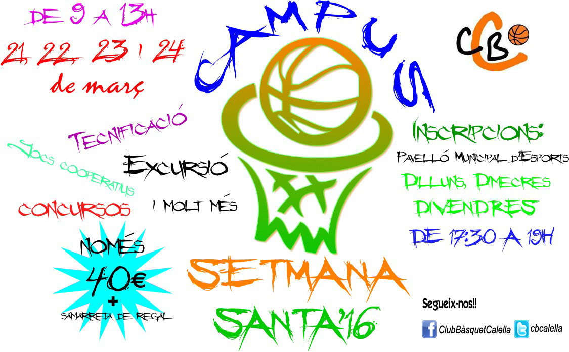 El CB Calella organitza el seu tercer Campus de Setmana Santa, que es realitzarà al Pavelló Municipal d’Esports del Parc Dalmau. Durarà quatre dies, del 21 al 24 de març, coincidint amb el període de vacances escolars, i combinarà l’aprenentatge i la tecnificació amb activitats lúdiques. Les inscripcions estan obertes i el preu és de 40 euros.