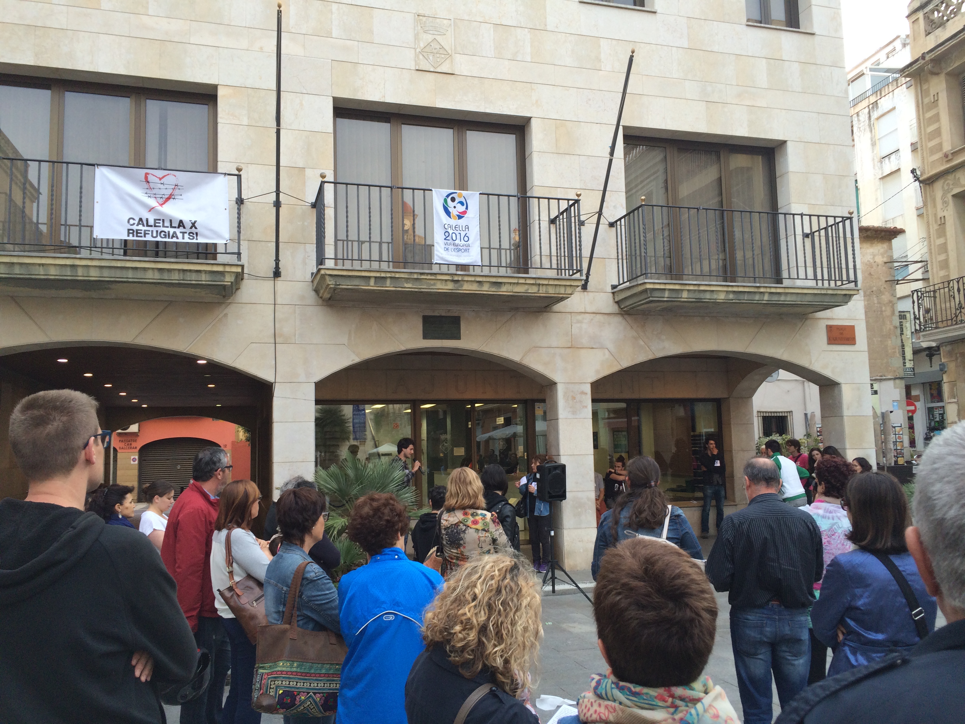 Calella pels Refugiats ha penjat el cartell de l’assemblea local a un dels balcons de l’edifici consistorial, en una acció més que, explica Millán, busca remoure consciències i donar força al seu moviment.