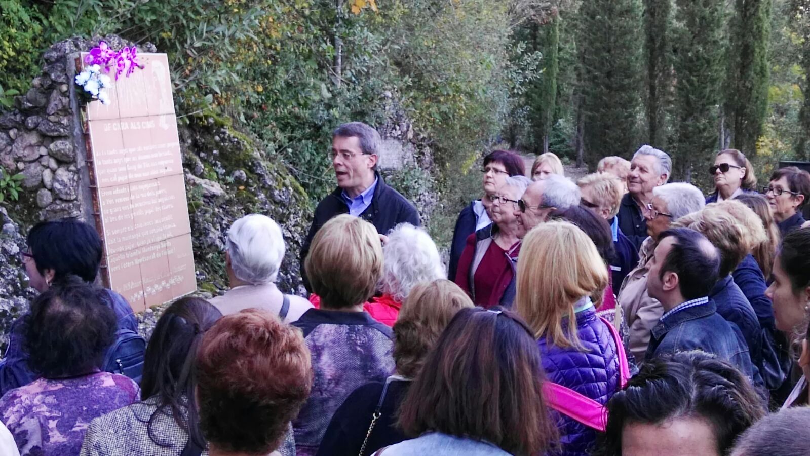 Els Calellencs, de romeria a Montserrat, han anat a passar el matí al camí dels Degotalls junt amb el rector de Calella Mossèn Cinto Busquets on han fet un homenatge a la majòlica que parla de Calella i han llegit una poesia de Maria Cardona