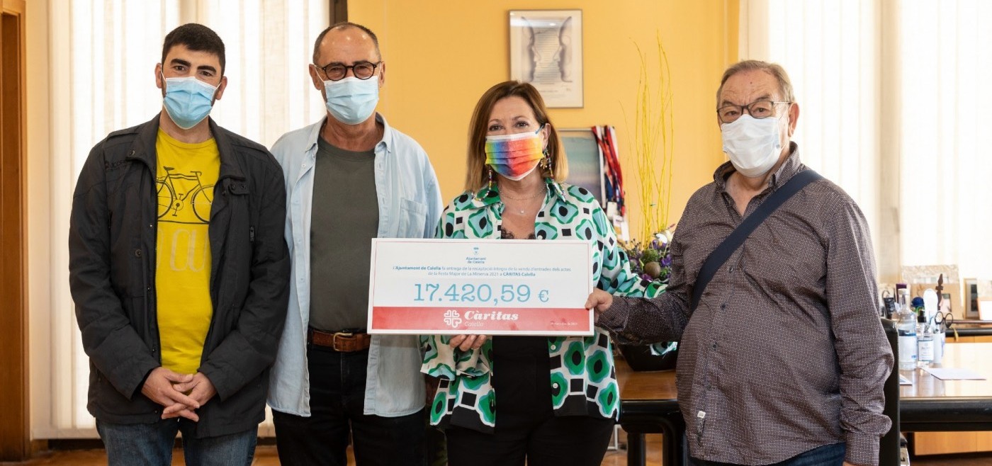 L’alcaldessa i el tinent d’Alcaldia de Política Social han fet l’entrega a Càritas Calella del xec solidari amb la recaptació íntegra de la venda d’entrades dels espectacles de Festa Major de la Minerva 2021. Un donatiu de 17.420,29 euros que l’entitat benèfica destinarà a finançar els projectes d’ajuda i assessorament que duu a terme a la ciutat en favor de les persones en situació de vulnerabilitat. L’acte va tenir lloc ahir a l’edifici consistorial i hi van assistir el president i el tresorer de Càritas Calella, Antoni Borràs i Josep Vidal, respectivament.