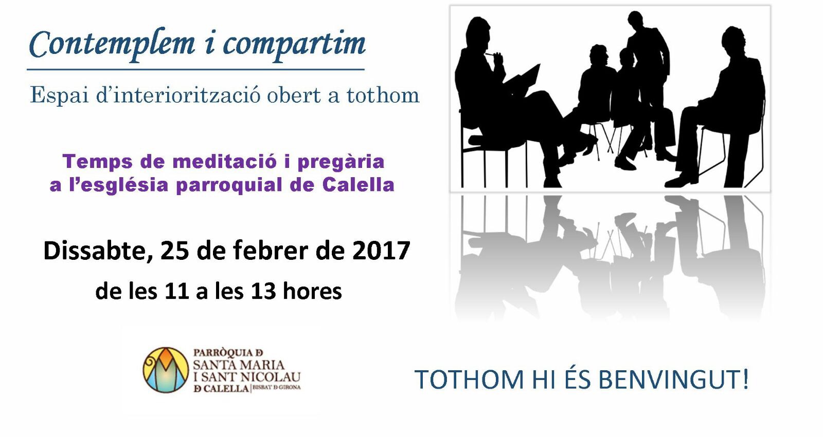 La parròquia de Santa Maria i Sant Nicolau de Calella ha organitzat per aquest dissabte una nova trobada del «Contemplem i compartim». Es tracta d’un espai de meditació, interiorització, silenci i pregària obert a tot el públic.