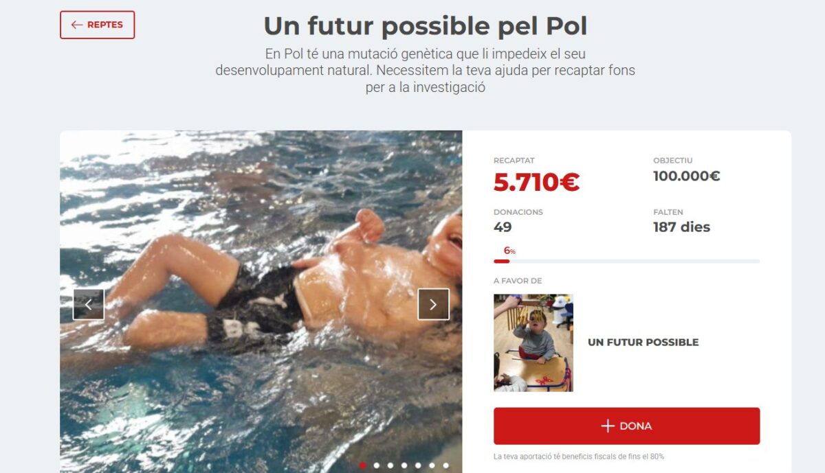 La campanya es vehicula a través de la plataforma de crowdfunding social i solidari migranodearena.org i l’objectiu és aconseguir 100.000 euros. Els diners cobriran l’estudi genètic a partir del qual es pot analitzar si hi ha fàrmacs al mercat que puguin frenar o millorar la seva condició.