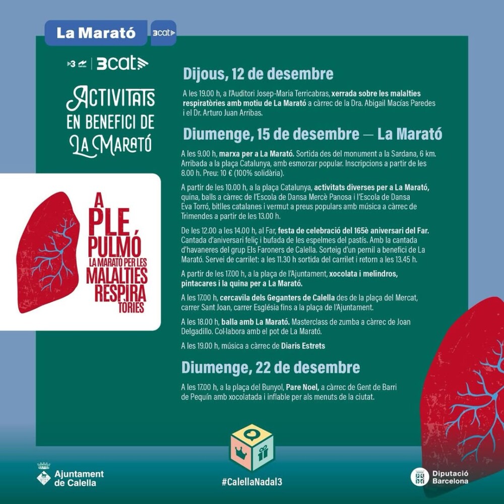 Amb la marxa per La Marató arrencarà la programació solidària que s’organitza a Calella per contribuir a la investigació mèdica i científica de les malalties respiratòries, en una edició que porta per lema A ple pulmó. Tret de sortida a les nou del matí des del monument a la Sardana del Passeig Manuel Puigvert i un recorregut de 6 quilòmetres pels voltants de Calella, amb arribada a la Plaça Catalunya, on es repartirà esmorzar per a tots els participants que s’hagi inscrit, havent fet un donatiu de 10 euros.