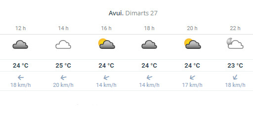 Jornada amb un cel molt ennuvolat, on s’esperen xàfecs d’intensitat feble. Les temperatures màximes baixaran lleugerament. De cara demà, les temperatures seguiran en treva i el cel molt ennuvolat.