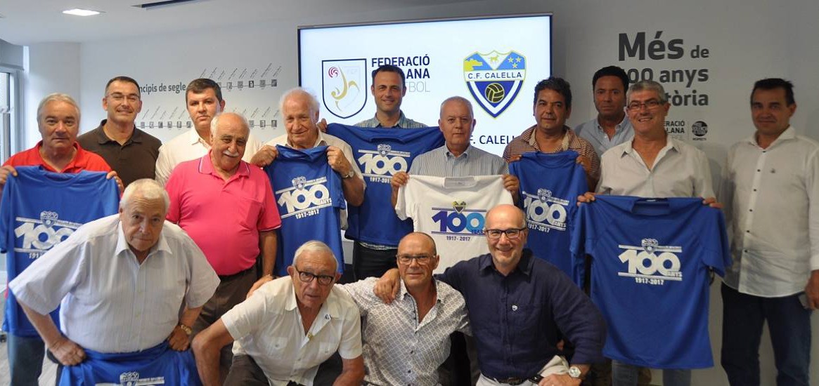Jordi Tubert va estar acompanyat dels expresidents Mateu Aspas, Ramon Coll, Fracesc Picó i Josep Ros, que es van fotografiar amb els responsables federatius amb la samarreta commemorativa del centenari del CF Calella.