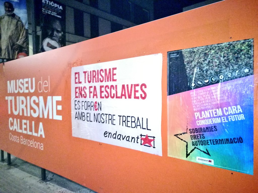 Calella ha estat l’escenari d’alguns de les accions de denuncia que el col·lectiu de l’esquerra independentista ha dut a terme en el marc de la campanya “El turisme ens fa esclaves. Es forren amb el nostre treball”. Van penjar cartells al plafó informatiu del Museu del Turisme i també en establiments de Pineda de Mar o Santa Susanna, en tant que capitals turístiques de l’Alt Maresme. Endavant replica les afirmacions del conseller d’Empresa i Coneixement, Santi Vila, que la setmana passada va lloar el model turístic local, dient que el territori registra les taxes d’atur més elevades de la comarca i que les rendes se situen per sota de la mitjana.