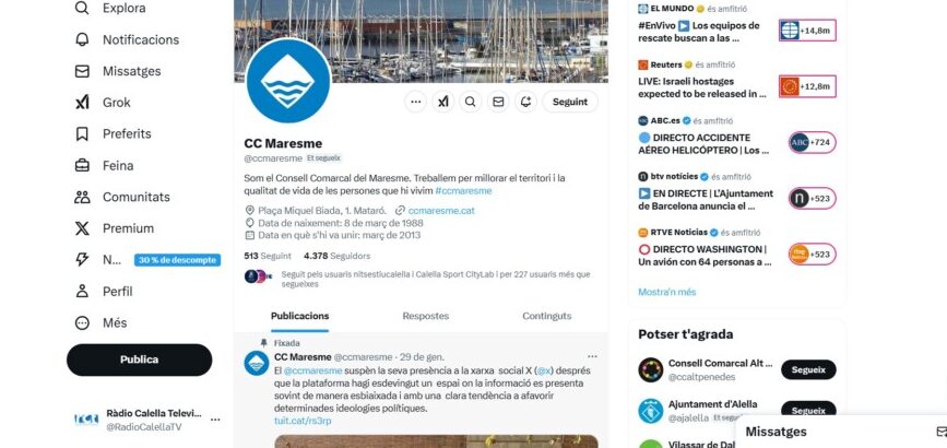 Com la ciutat de Barcelona o un mitjà de comunicació com La Vanguardia, i seguint la tendència dels ajuntaments de Sant Pol de Mar, Palafolls o Premià de Mar, també el Consell Comarcal del Maresme ha anunciat que deixa X, l’antiga Twitter, ara en mans de l’home més ric del món i un dels integrants de la nova administració de Donald Trump a la Casa Blanca, Elon Musk.