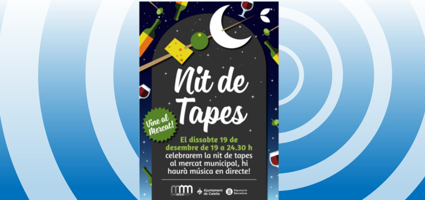 El Mercat Municipal de Calella s’obrirà durant la tarda i nit del dissabte 19 de desembre amb motiu de la seva primera Nit de Tapes. Els paradistes ompliran mostradors amb canapès i plats per fer tastos dels seus productes i elaboracions, afegint-se així a la moda d’acudir als mercats no només per omplir la nevera i el rebost sinó també per menjar, compartir l’estona amb els amics i gaudir de música en directe. La proposta està impulsada pels paradistes i l’Ajuntament de Calella, i donarà cabuda també a la participació d’altres tres establiments d’alimentació i restauració de la ciutat, a més de l’Associació de Voluntaris i Amics de l’Hospital, incorporant a la iniciativa gastronòmica una pinzellada de solidaritat.