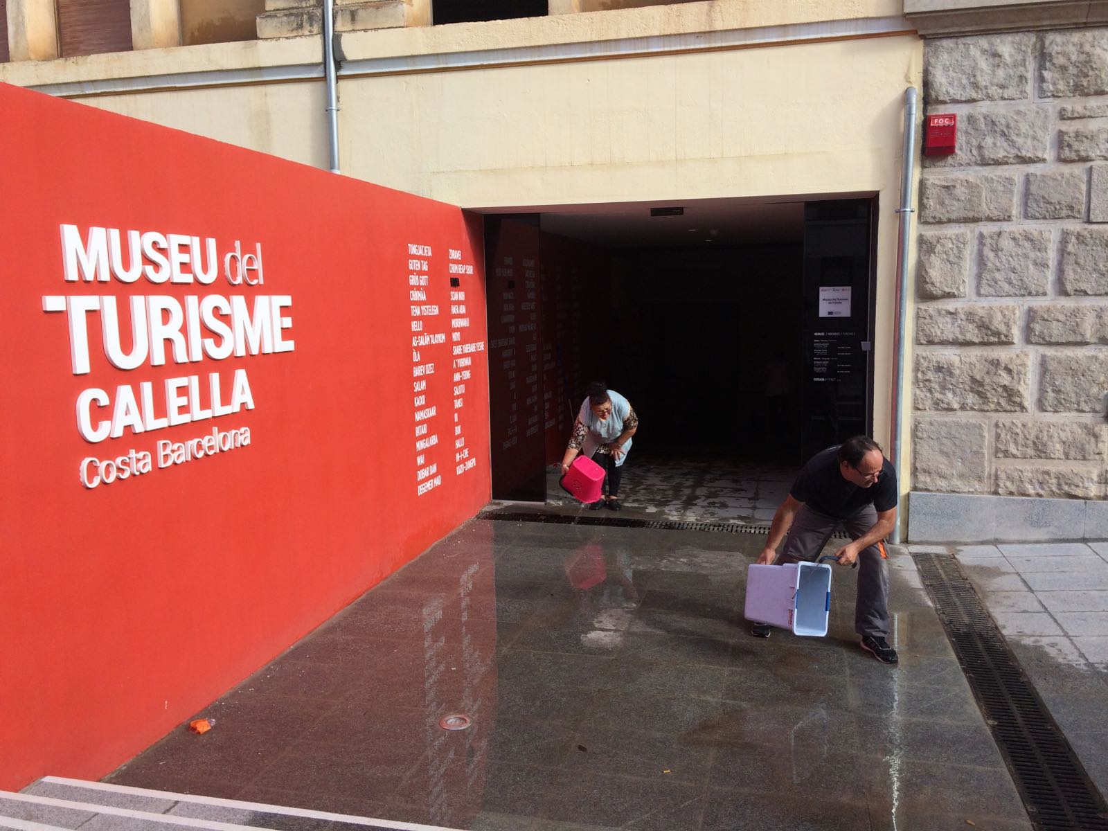 El ruixat d’aquesta matinada, curt però intens, ha tornat a afectar el Museu del Turisme. S’hi ha acumulat un dit d’aigua, que fins ben entrada la tarda han intentat retirar els treballadors municipals. Fonts de l’Ajuntament de Calella han explicat a Ràdio Calella TV que l’aigua s’ha colat a l’interior de l’equipament pels baixants de la teulada de la Fàbrica Llobet-Guri, que està en obres. Farà poc més d’un mes també es va inundar, coincidint amb la forta tempesta que va caure al conjunt del Maresme.