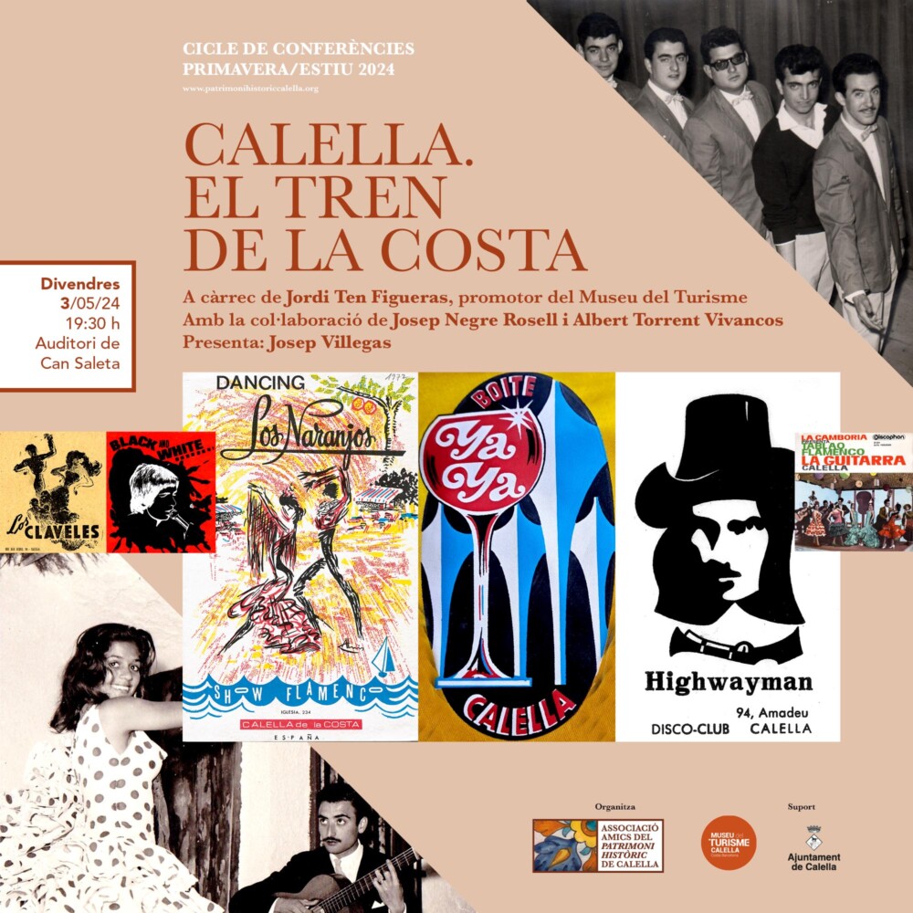La conferència “Calella, el tren de la Costa” s’insereix en el cicle de conferències de Primavera/Estiu dels Amics del Patrimoni. Viatjarà al passat turístic, relacionant-lo amb el tren que arriba a Calella amb els turistes i l’¡oci nocturn. La conferència anirà a càrrec de Jordi Ten, promotor del Museu del Turisme (MUTUR) amb la col·laboració de Josep Negre i Albert Torrent, moderat per Josep Villegas. Començarà a les 19.30 h a Can Saleta i es podrà seguir en directe a través del canal de YouTube dels Amics del Patrimoni.