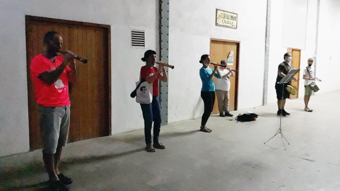 Ho farem des del balcó de l’Ajuntament perquè és on sempre els gegants comencem i acabem les cercaviles i és un lloc simbòlic. Els grallers estan assajant al local del dels geganters perquè és on poden mantenir la distància de seguretat i complir totes les noves mesures.