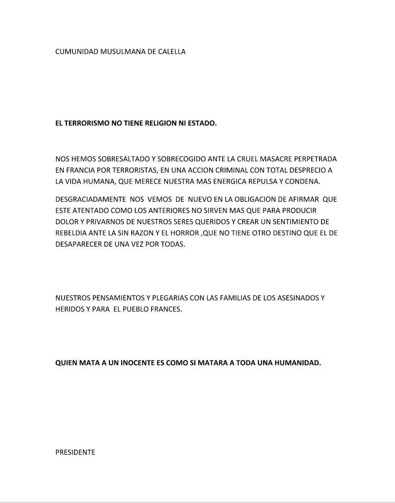 A través d’un comunicat, els musulmans de Calella s’uneixen al dolor dels familiars de les persones assassinades i dels ferits en aquests atacs terroristes i subratllen que el terrorisme no té religió ni té Estat. Mimoh Jalisch és el president de la Comunitat Musulmana de Calella i president de la Unió de Centres Culturals Islàmics de Catalunya: “Condemnem aquests fets i hem de tenir clar que el terrorisme no té ni religió ni Estat. Ens ha colpit aquesta cruel massacre perpetrada per terroristes a França. És una acció criminal que demostra un total menyspreu a la vida humana que condemnem. Aquest atemptat només serveix per crear dolor i privar-nos dels éssers estimats”.