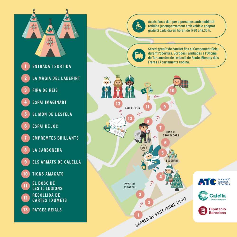 El Campament Reial de Calella està preparat per a l’obertura de portes, aquesta tarda a partir de les 17.30h. Durant tres dies, del 2 al 4 de gener, els infants podran lliurar les cartes als patges de Melcior, Gaspar i Baltasar, i endinsar-se en un univers de màgia i il·lusió on gaudir de les propostes familiars que aquest any arriben amb novetats. El recinte del Parc Dalmau comptarà amb un vehicle adaptat perquè les persones amb mobilitat reduïda puguin desplaçar-se per l’interior del campament. A més, hi haurà servei de transport gratuït amb el Carrilet, amb parades a l’Oficina de Turisme, l’estació de tren, el Rierany dels Frares i els Apartaments Codina.
