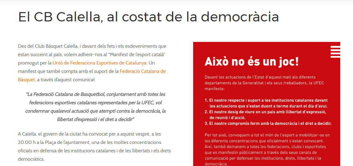 El CB Calella ha fet pública la seva adhesió al Manifest de l’esport català, promogut i fet públic ahir per la Unió de Federacions Esportives de Catalunya. En ell s’expressa el suport a les institucions catalanes davant les actuacions que van tenir lloc, es reitera el desig de viure en un país amb llibertat d’expressió, de reunió i d’acció. Per últim, compromís del món de l’esport amb la democràcia i el dret a decidir.