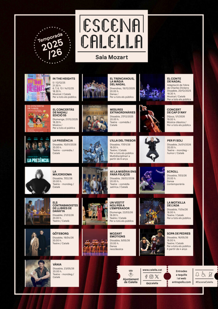 L’Ajuntament de Calella ha presentat la nova temporada d’Escena Calella, el cicle de teatre, dansa i música de la ciutat. La programació s’allargarà del 5 de desembre al 23 de maig, amb propostes variades i per a tots els públics. El cartell combina rostres destacats de la cultura catalana, com Mercè Arànega, Pere Arquillué, Nausica Bonnín, Joel Joan o Carles Sans, del Tricicle, amb el talent de quilòmetre zero, gràcies a les produccions de l’Atsoc, el centre de dansa La Fàbrica, l’Agrupació Sardanista de Calella, l’Orquestra Simfònica Ciutat de Calella i la companyia Teatre al Detall. La venda anticipada d’entrades i abonaments és exclusiva als socis i sòcies del Club Escena Calella fins al divendres 7 de novembre, amb la possibilitat d’unir-s’hi actualment. La compra es pot fer a través del portal entrapolis.com. A partir d’aquesta data, s’obrirà al públic general.