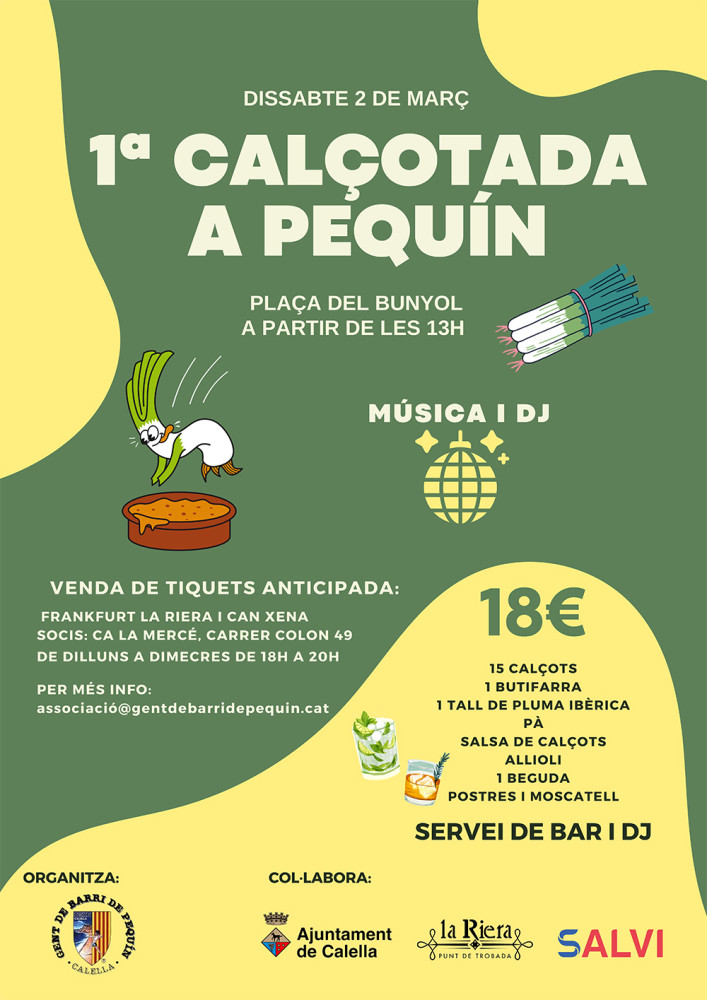 Calçotada popular amb carn a la brasa. És la proposta de Gent de Barri de Pequín per aquest dissabte 2 de març, incorporant una nova festa al seu calendari gastronòmic. L’any passat ho van fer conjuntament amb Calella Marxa i ara ho proven en solitari, amb la intenció de coure 5.000 peces de calçots i servir-los amb salsa autèntica i dues peces de carn: botifarra i un tall de ploma ibèrica. El tiquet incloure pa, beguda i postres, i tot per 18 euros. Hi haurà estesa de taules i cadires per a 300 persones.