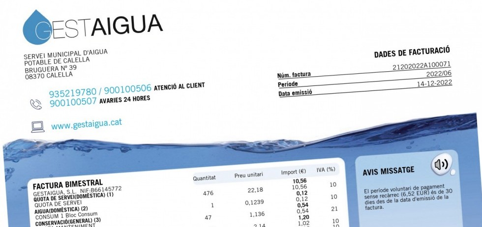 La factura de l’aigua s’apujarà un 17% el 2023. La nova tarifació incorpora una nova bonificació per a les persones en situació de vulnerabilitat, a qui es passarà a cobrar només una quota fixa per cobrir els cànons – serà a l’entorn de 9 euros –, sempre i quan no se’n faci un sobreconsum. La proposta es va aprovar en l’últim Consell d’Administració de Gestaigua gràcies als vots a favor dels consellers delegats dels partits del Govern i de la part privada de la companyia; i amb els vots en contra dels que representen Esquerra i Calella en Comú, els partits de l’oposició. Haurà de ser ratificada pel Ple Municipal perquè entri en vigor.