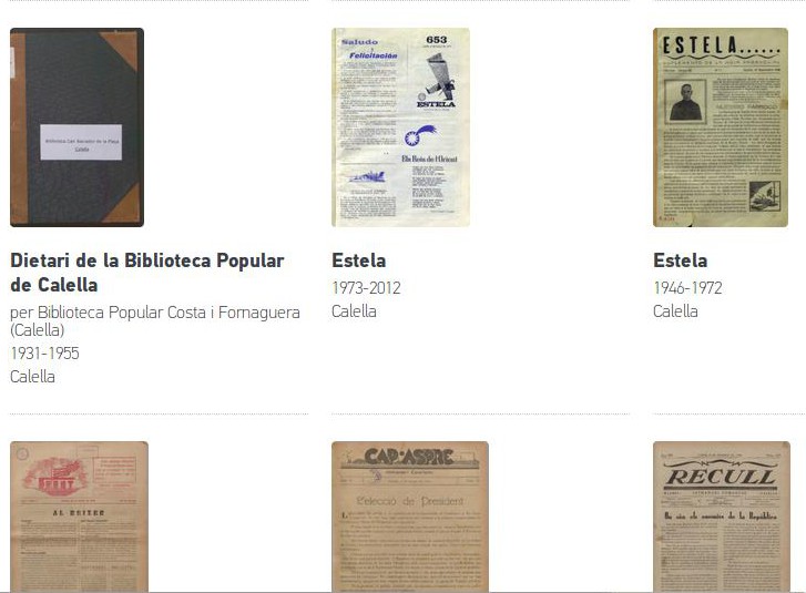 Concretament hi trobarem l’antiga revista «Capaspre» de Calella, publicada entre l’any 1933 i 1936. També la revista «El Front» publicada l’any 1934, i la revista «Recull» de 1931 i 1932. I una de més viva en la memòria dels calellencs com és la revista «Estela», que ha publicat notícies de Calella des de l’any 1946 fins fa just tres anys, quan l’any 2012 es va deixar de publicar. I recentment també s’hi ha incorporat el «Dietari de la Biblioteca Popular de Calella» en dates des de l’any 1931 al 1955.