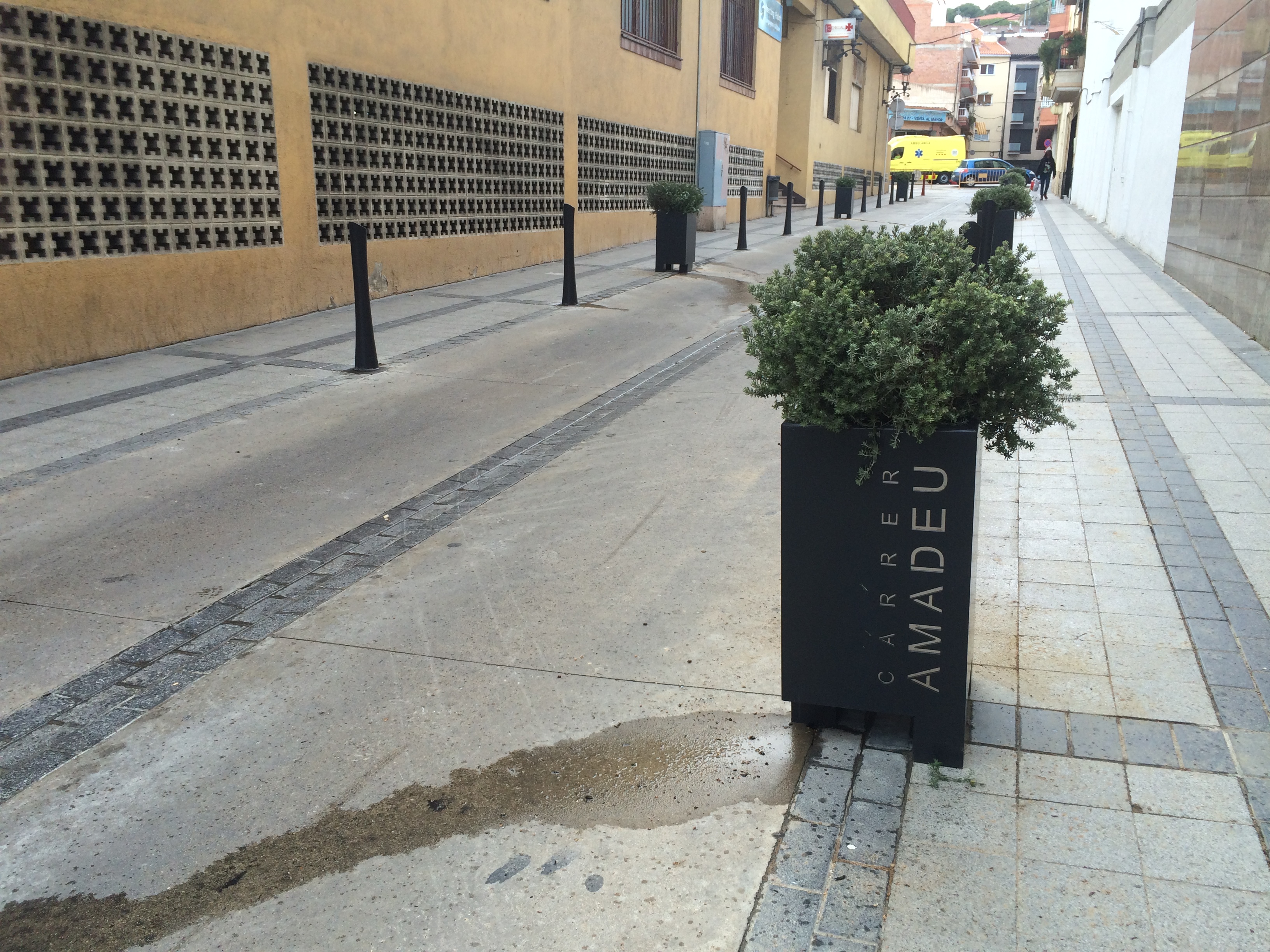 Aquesta tarda arribaven fins al carrer Sant Antoni. Les noves jardineres de ferro forjat negre s’han començat a instal·lar avui al carrer Amadeu, completant el procés de millora estètica de la via que va arrencar amb a substitució de les pilones baixes que hi havia fins ara. El canvi està motivat també per raons de seguretat, doncs els anteriors elements de separació del pas de vianants i vehicles havien provocat més d’una entrebancada.