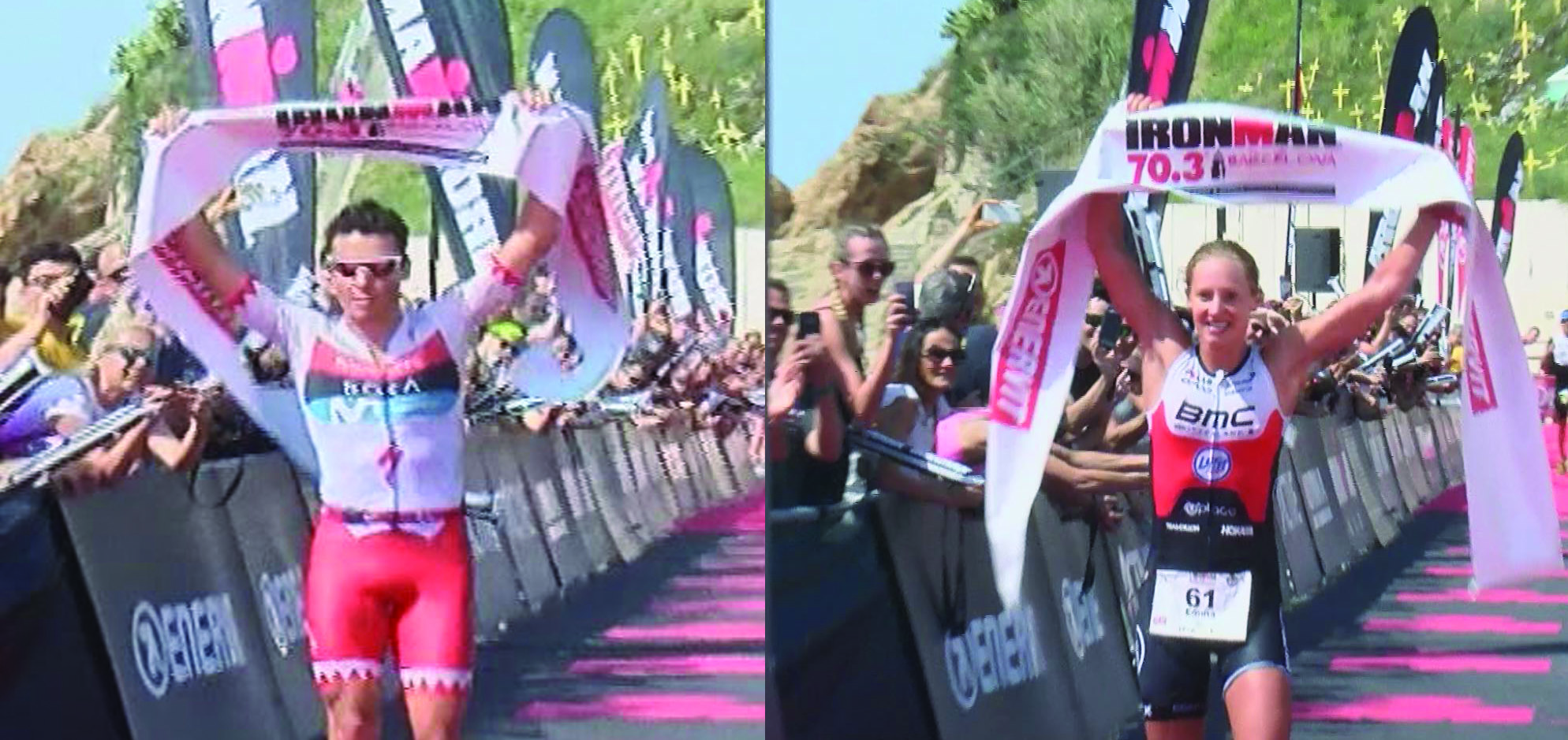 Javier Gomez Noya i Emma Pallant primers en arribar a la meta de Ironman 70.3 Barcelona