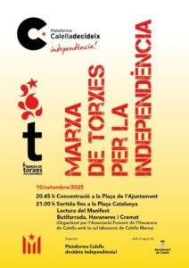 La Plataforma Calela Decideix Independència tornarà a organitzar la tradicional Marxa de Torxes el pròxim 10 de setembre. Així ho ha explicat el portaveu de l’entitat, Josep Barri, en una entrevista a RCT. Segons Barri, la marxa serà l’única activitat que mantindran activa enguany. El portaveu ha recordat que la territorial de l’Assemblea Nacional Catalana (ANC) a Calella es va dissoldre el 31 de desembre passat, fet que va provocar la desaparició de diverses accions que anteriorment havien mobilitzat desenes d’autocars cap a les manifestacions de l’11 de setembre a Barcelona, així com la venda de samarretes o la participació en l’ofrena institucional.