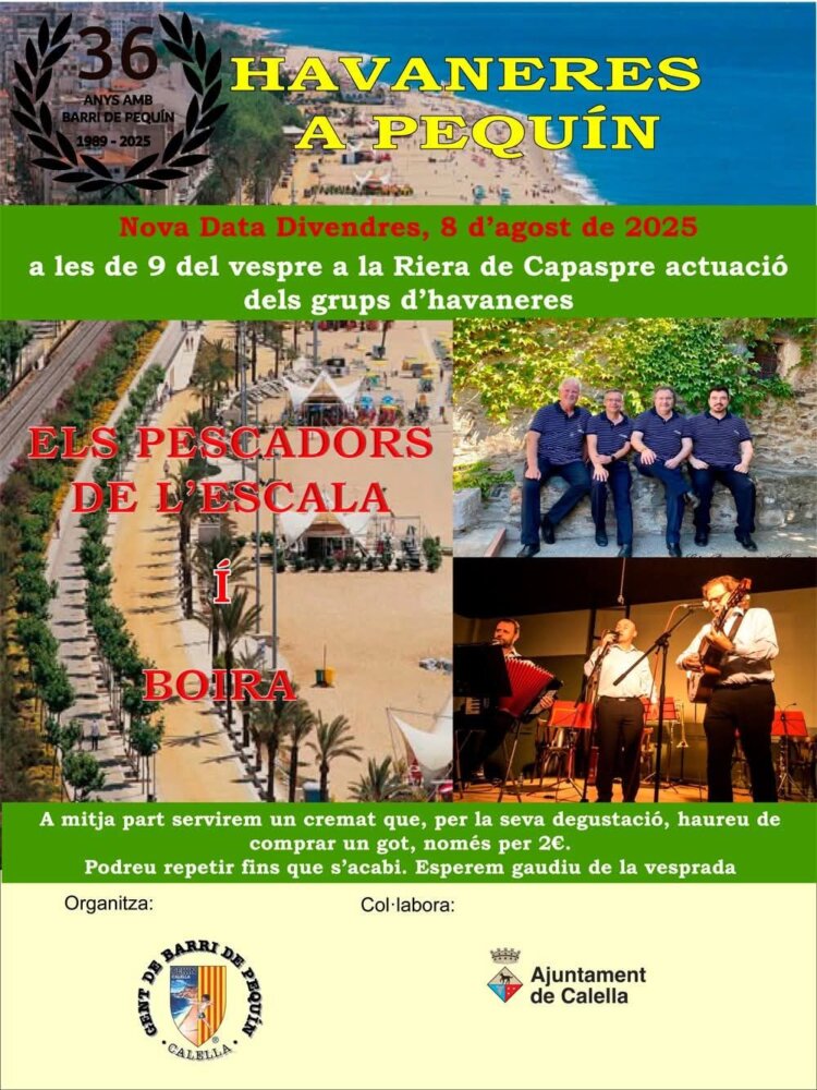 Nova data per a la cantada d’havaneres de Pequín que s’havia de celebrar el passat cap de setmana i es va anul·lar a última hora per risc de pluja. Gent de Barri de Pequín ha anunciat que l’ha reprogramat pel divendres 8 d’agost, al mateix lloc i hora: a la Riera Capaspre, a partir de les 21h.