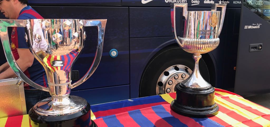 L’autocar del FC Barcelona porta a Calella els trofeus que l’equip ha guanyat aquesta temporada: la Lliga i la Copa del Rei. Es podran anar a veure i fotografiar-s’hi de les onze del matí a les nou del vespre, a la Riera Capaspre.