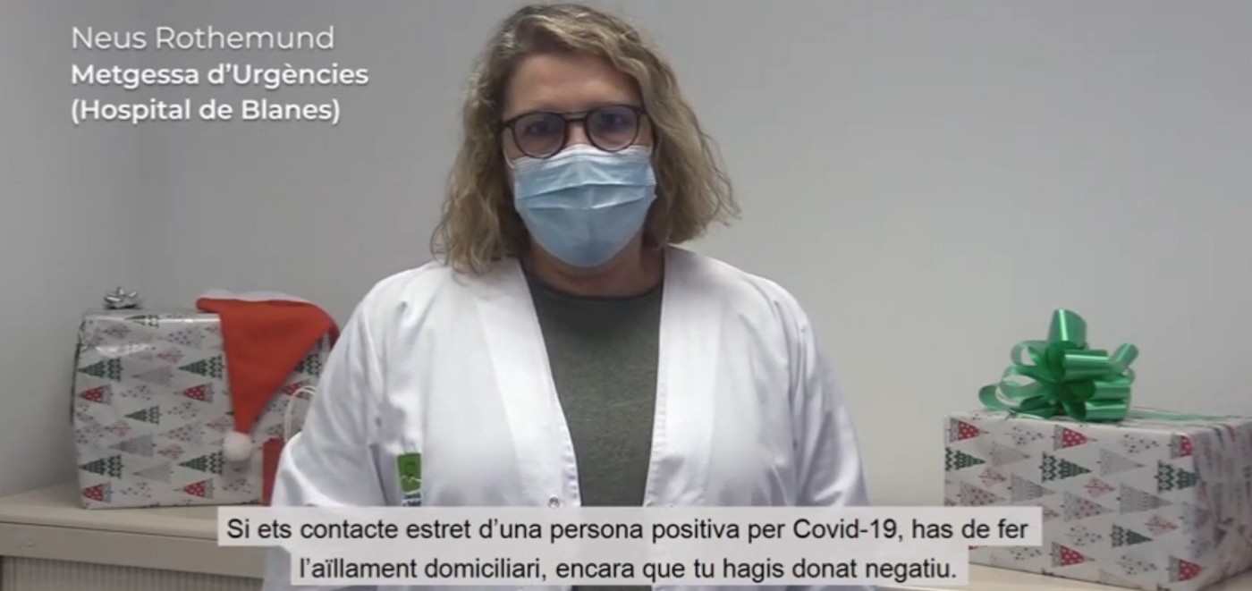 El primer dels vídeos el protagonista una de les metgesses d’Urgències de l’Hospital de Blanes, la doctora Neus Rothemund, i parla de la importància de complir amb l’aïllament si s’és contacte estret d’un positiu.