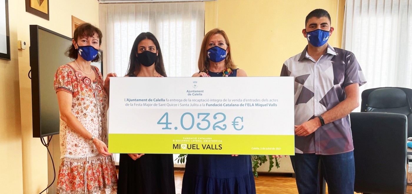 L’Ajuntament de Calella ha fet entrega d’un xec per valor de 4.032 euros a la Fundació Catalana d’ELA Miquel Valls, corresponent a la recaptació íntegra de la venda d’entrades dels espectacles de la Festa Major petita del passat mes de juny. L’entitat els destinarà a finançar els diversos projectes i línies d’atenció que duu a terme en favor dels malalts d’esclerosi lateral amiotròfica i els seus familiars.