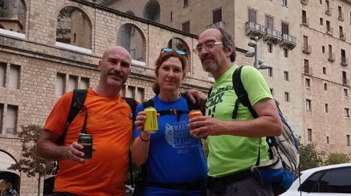 La Mercè Montserrat, en Lluis Barri i l’Andreu Mateu són els tres atletes que han fet els 94 quilòmetres que separen Calella de Montserrat. Han arribat a dos quarts de dotze a Montserrat. Durant tot el trajecte (van sortir de Calella ahir al migdia) han hagut de parar per sopar en un restaurant (just una hora) i descansar una estona (10 minuts). El pitjor moment és de nit, com explica una de les integrants, la Mercè, que a més coincideix amb la meitat del trajecte.