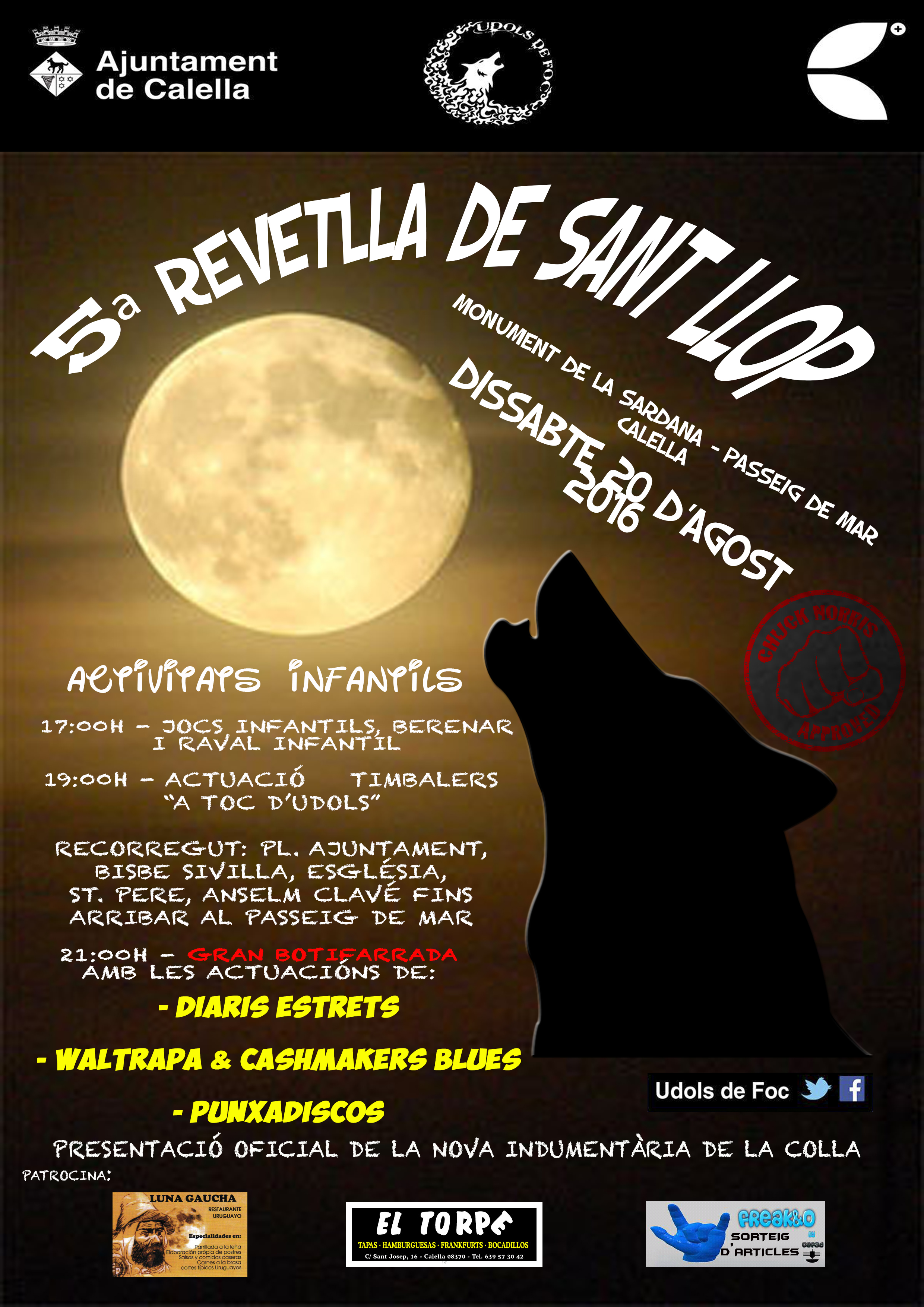 Cartell Revetlla Sant LLop 2016De cinc a set del vespre hi haurà activitats i tallers infantils. Després, berenar per a la mainada.