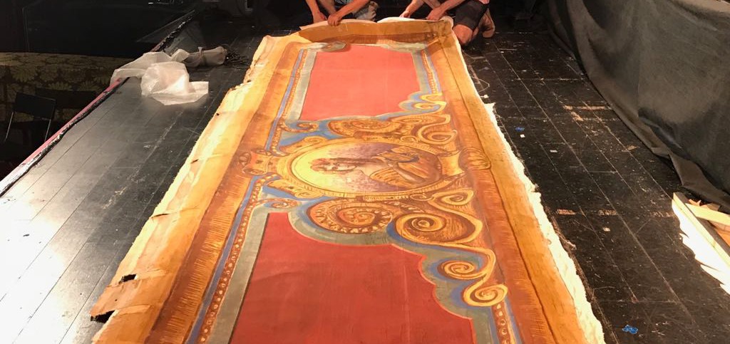 És una peça històrica en el temps, està datada de finals de 1800, del 1890 i escaig, i havia sigut el faldó de l’antic teló pintat habitual de l’època. Aquest teló, per la seva feblesa va desaparèixer, segurament sobre els anys 40, però això va ser com tantes restes de tantes escenografies, guardat a dalt als telars. En el moment de les obres es va ensenyar als germans Castells, que són els escenògrafs més importants que té el país i uns enamorats del teatre, i al veure-ho van dir que era una peça històrica que els feia il·lusió, dins del que es pogués, restaurar.