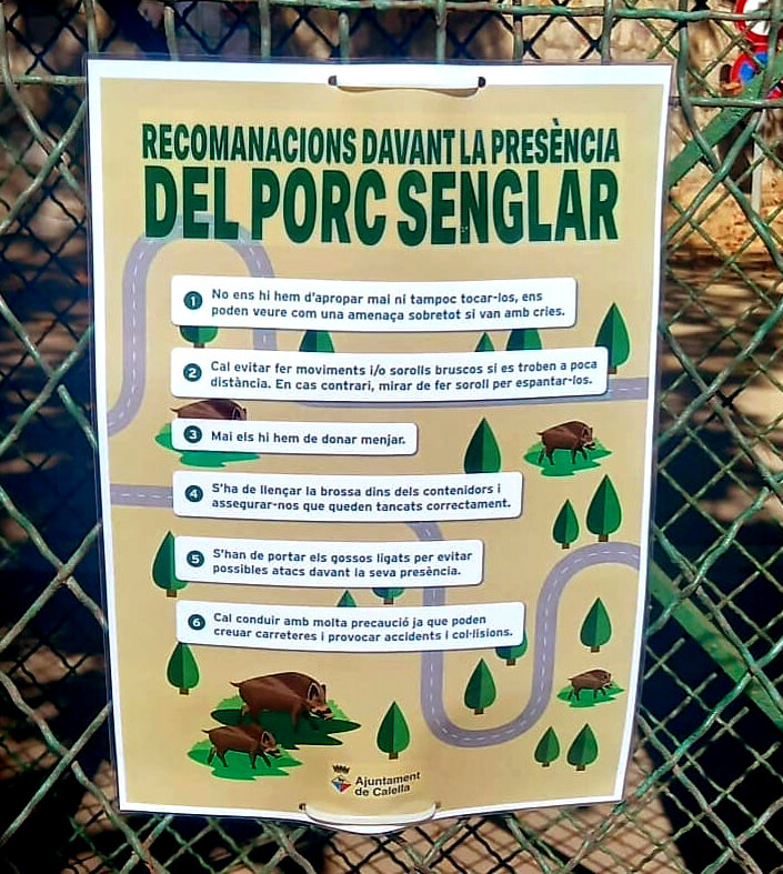 Finalment, s’han instal·lat cartells informatius a l’entorn del Parc Dalmau amb un seguit de recomanacions adreçades a la ciutadania. Com ara: no apropar-s’hi ni tocar-los, llançar la brossa dins els contenidors i assegurar-se que queden ben tancats o portar els gossos lligats. També es demana que s’avisi a la Policia Local o trucar al 112 en cas de detectar un senglar dins del nucli urbà de Calella.