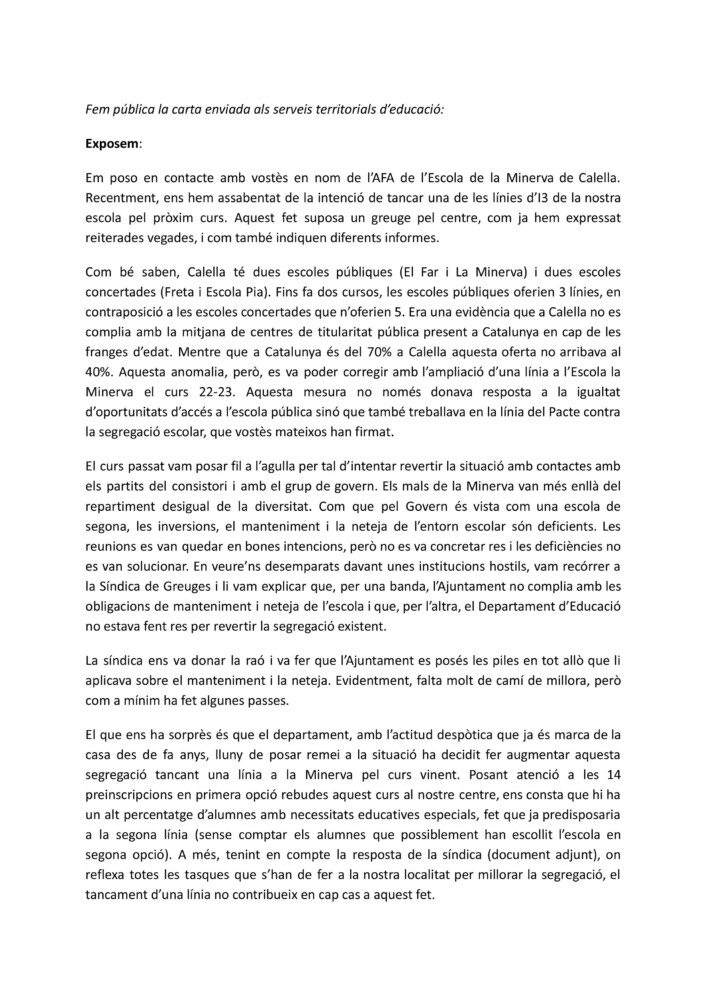 Cliqueu sobre la imatge per accedir a la carta de l’AFA de La Minerva dirigida als Serveis Territorials d’Educació: