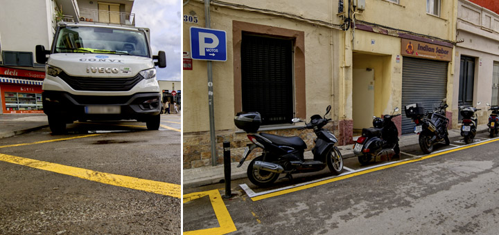 La reordenació dels serveis de l’entorn es va enllestir la setmana passada i ja funciona segons els nous usos. A l’espai nou de Jovara, al costat del que ja hi havia amb aparcament en modalitat de bateria, les motos s’han de deixar en línia perquè hi hagi més amplada de calçada per a la circulació de vehicles i permetre la maniobra de gir de l’autobús que fa el recorregut entre Calella i Pineda de Mar. De fet, al mateix xamfrà, hi ha un espai alliberat delimitat per pilones.