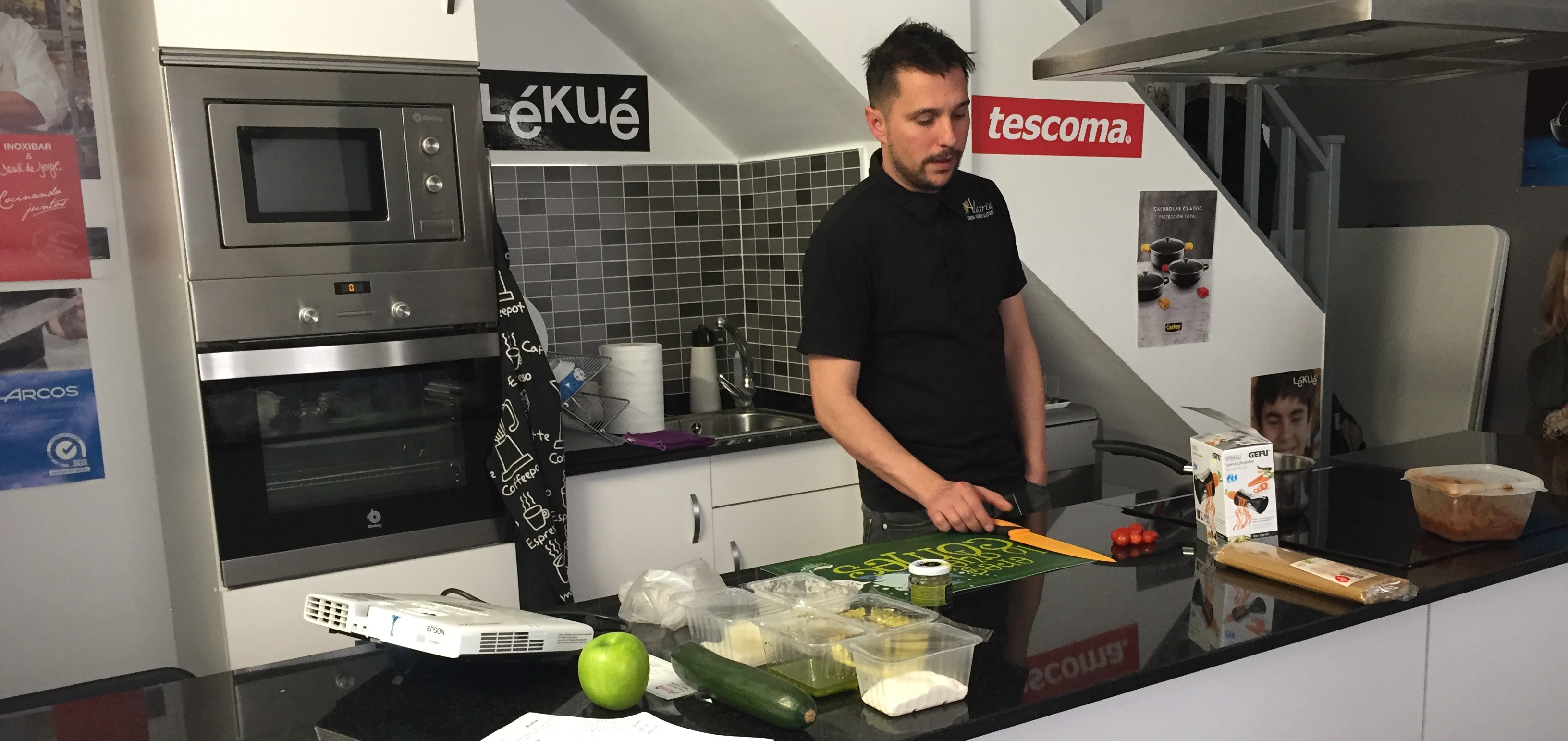 En el marc de la Setmana de la Salut de Calella, avui s’ha celebrat un showcooking, una classe de cuina d’un plat sense gluten a càrrec de l’empresa de productes sense gluten pinedenca Alatria. Han parat especial atenció a explicar al risc de contaminació creuada que es produeix entre els aliments amb i sense gluten quan es cuina a casa.