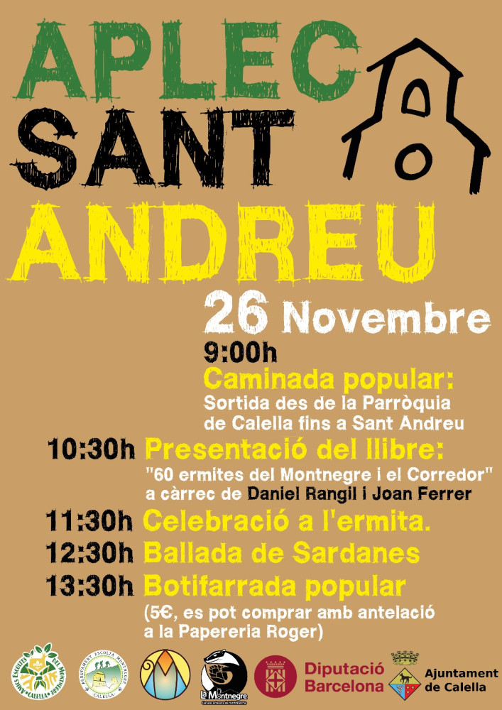 Aquest serà el tercer Aplec de Sant Andreu. S’ha previst una caminada popular – no guiada – fins a l’ermita des de la Parròquia de Santa Maria i Sant Nicolau, que sortirà a les nou del matí. Es calcula que s’hi arribarà al cap d’una hora i mitja, com a màxim. A partir de llavors, es faran les activitats previstes. Hi ha la presentació del llibre 60 ermites del Montnegre i el Corredor amb els seus autors, Daniel Rangil i Joan Ferrer, i la celebració de la paraula amb l’escolapi i membre d’Amics Escoltes del Montnegre, Aniol Noguera. Com antigament, hi haurà una ballada de sardanes que inclourà la peça Camí de l’Arboceda, composta per Marta Tarridas i, per acabar, una botifarrada amb pa amb tomàquet. És el primer cop que s’organitza un dinar popular.