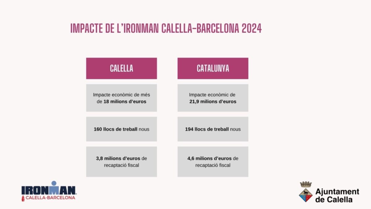 L’Ajuntament ha presentat els resultats d’un estudi encarregat al Tecnocampus que tradueix en dades la percepció que l’IRONMAN és un esdeveniment positiu per a Calella en termes econòmics. És a dir, que l’aportació municipal directe de 150.000 euros anuals en concepte de patrocini – que es paguen amb els diners de la taxa turística – retorna i de forma multiplicada.