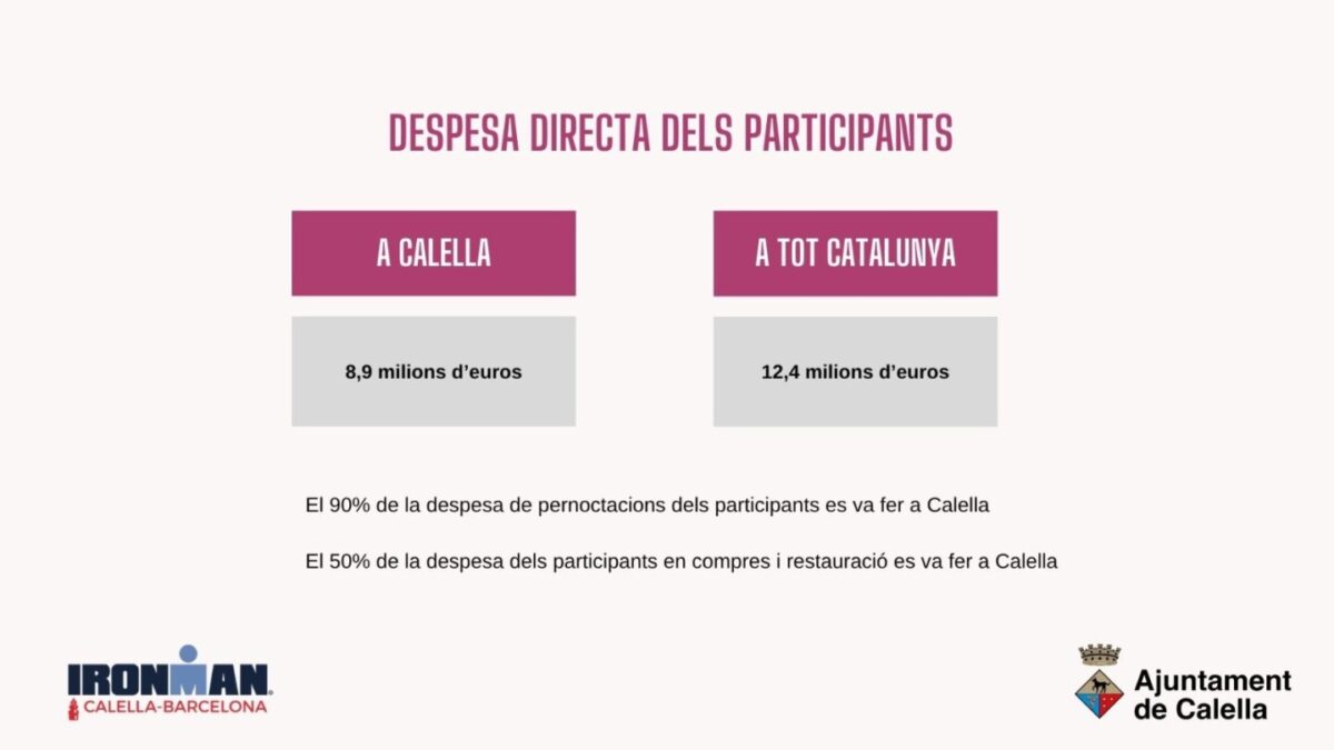 Dels més de 3.000 atletes inscrits en l’IRONMAN Calella-Barcelona del desè aniversari, el 90% van allotjar-se a la ciutat, amb una estada de cinc dies i acompanyats de dues persones, de mitjana. L’estudi indica que, en conjunt, entre transport, allotjament, compres i restauració, el volum de despesa generat va ser de 12,4 milions d’euros. D’aquests, gairebé 9 milions es van quedar a Calella.