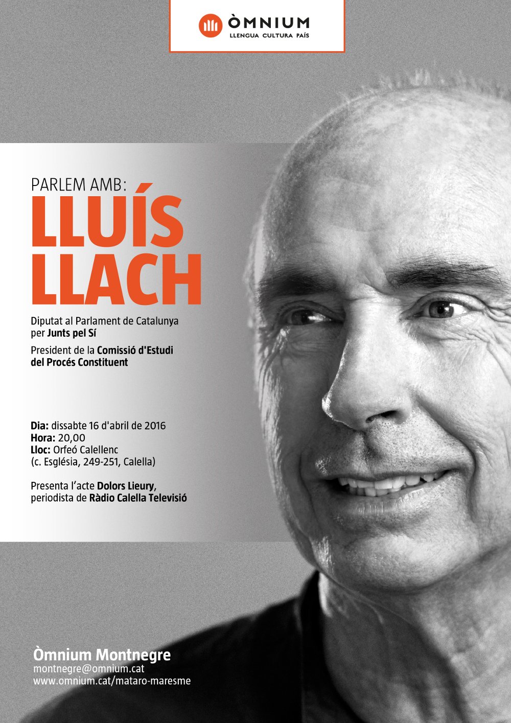 El diputat de Junts pel Sí va ser designat a principis de març president de la comissió d’estudi del procés constituent, en substitució de Muriel Casals, l’expresidenta d’Òmnium Cultural. L’entitat al Montnegre organitza la xerrada que Lluís Llach oferirà demà a les 8 del vespre al Teatre Orfeó Calellenc, amb entrada gratuïta. Donarà detalls de la feina de reflexió i anàlisi que s’està fent en el marc de la comissió que integren cinc dels set partits de l’arc parlamentari.
