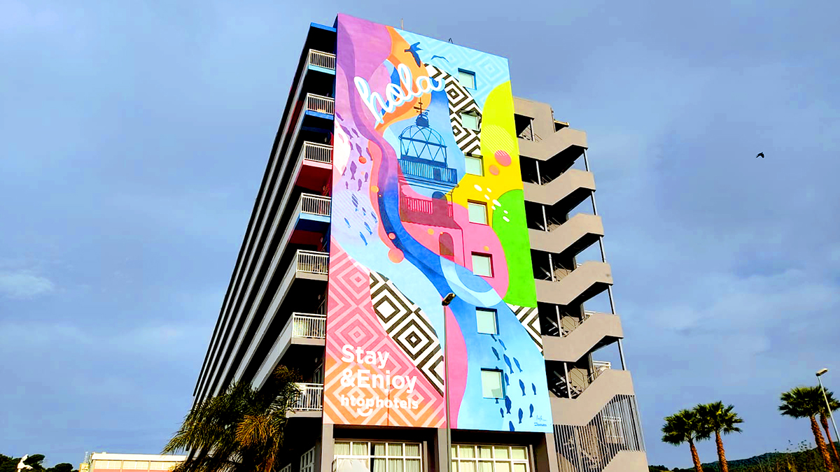 La silueta del Far de Calella en un mar de colors embelleix una de les parets de l’hotel Htop Olympic, que s’acaba de reformar íntegrament. La nova estètica de l’edifici ha causat sensació i ha despertat la curiositat sobre qui és l’autor d’aquesta obra artística de gran format que ocupa una superfície de 200 metres quadrats. A partir d’un disseny de l’equip de la cadena hotelera, l’encarregat de materialitzar-ho ha estat el muralista mataroní Mateo Lara. Ell és un expert i referent en obres de gran format. Se’l va escollir per realitzar el mural Pioneres de la Vall d’Hebron, que mostra nou dones que han fet avançar la ciència en l’àmbit de la salut. Però la seva signatura també la trobem en altres espais com la persiana del ‘room scape’ Tao Massage.