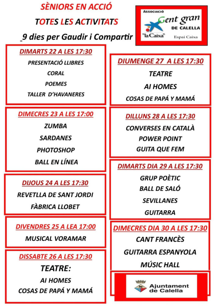 Aquesta tarda es donarà el tret de sortida a la programació de la setmana gran de l’Espai Caixa, amb activitats musicals i literàries, com la presentació dels llibres que han publicat els socis i sòcies de l’entitat, que ja superen el miler. S’allargarà durant nou dies amb demostracions a la sala d’actes del local del carrer Bartrina. A més, celebraran Sant Jordi amb una revetlla i ball a la polivalent de La Fàbrica. A través d’aquesta acció, el col·lectiu de gent gran de Calella reivindica una jubilació activa i la lluita contra la soledat i l’edatisme.