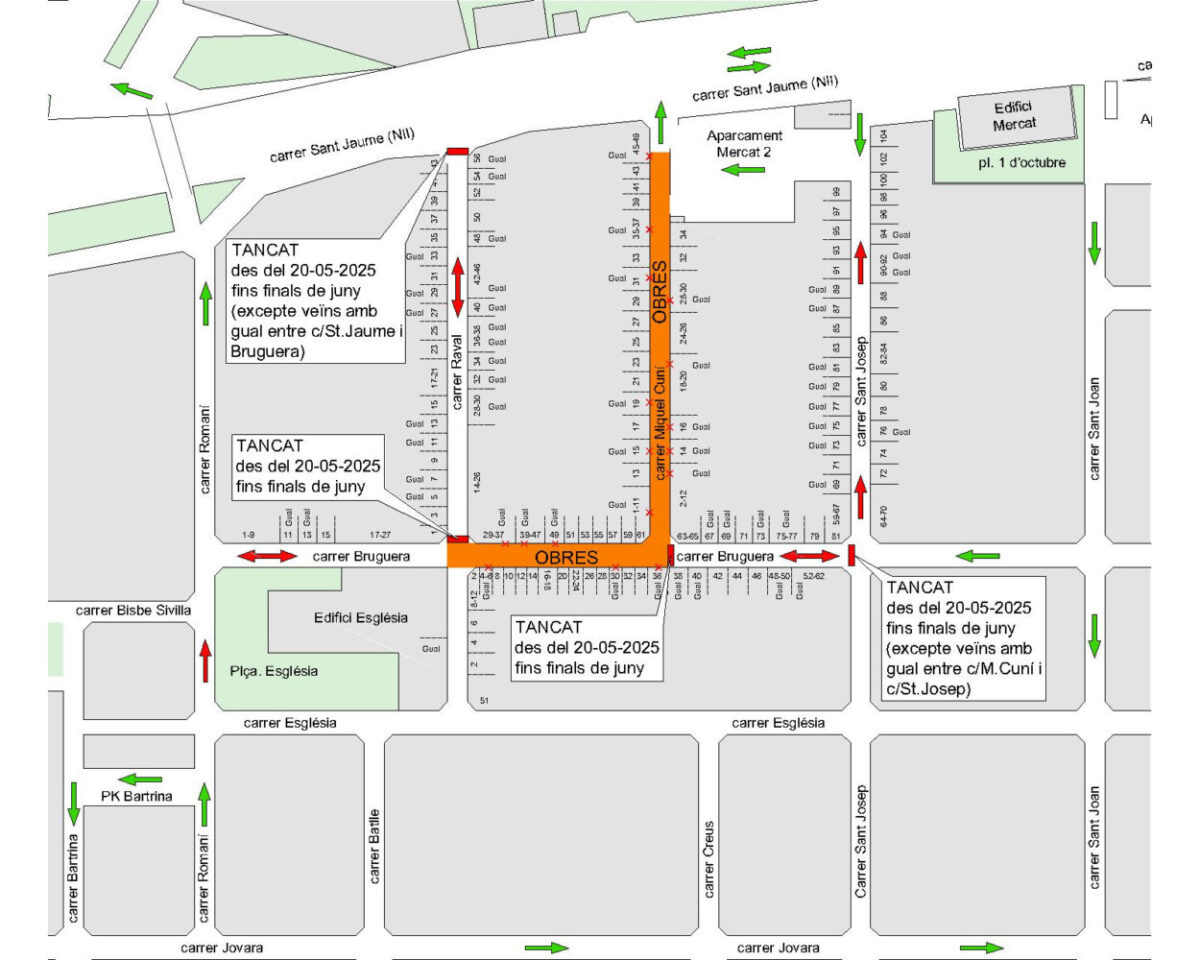 Per l’inici de la tercera i última fase de les obres de remodelació integral dels carrers del centre, des d’avui dimarts 20 de maig i fins a finals de juny no es podrà circular per Miquel Cuní, que s’ha d’acabar d’asfaltar; i el tram de Bruguera entre Miquel Cuní i Raval perquè es duguin a terme els treballs de renovació de la xarxa de serveis soterrats – pluvials i clavegueram – i la posterior urbanització superficial. Per contra, s’ha reobert el Sant Josep. L’Ajuntament ha informat sobre com queda ordenada la circulació per aquest sector, confirmant que l’aparcament Mercat 2 seguirà operant amb normalitat.