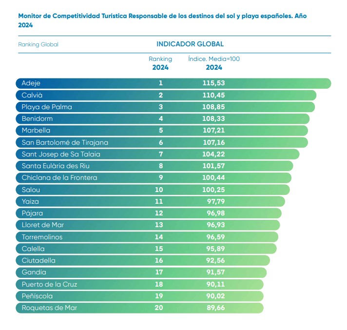La destinació costera més competitiva a nivell estatal, segons Exceltur, és Adeje (Santa Cruz de Tenerife, Illes Canàries), amb un índex mitjà de 115,5. Seguida de Calvià (Mallorca, Illes Balears), amb un 110,45; Platja de Palma (Palma de Mallorca, Illes Balears), 108,85; Benidorm (Alacant), 108,33; i Marbella (Màlaga), 107,21. La primera població catalana que apareix al rànquing és Salou, ocupa la desena posició amb un índex competitiu de 100,25; i després Lloret de Mar, tretzena amb un índex de 96,93.